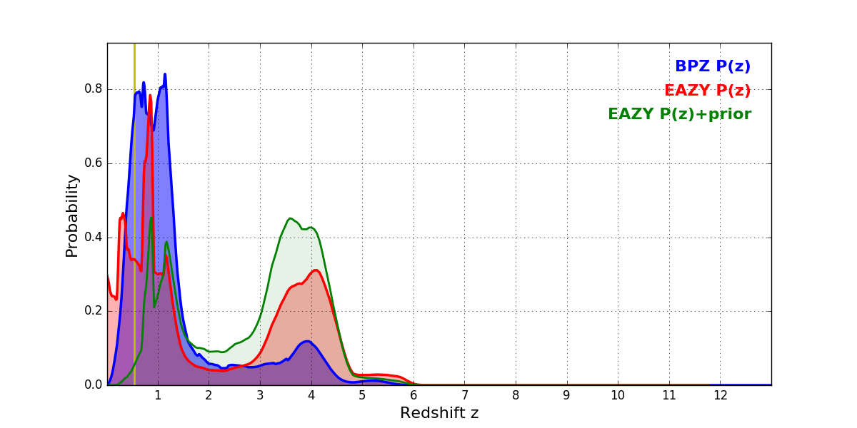 In P(z) plots: Yellow lines mark the cluster redshift z = 0.546,