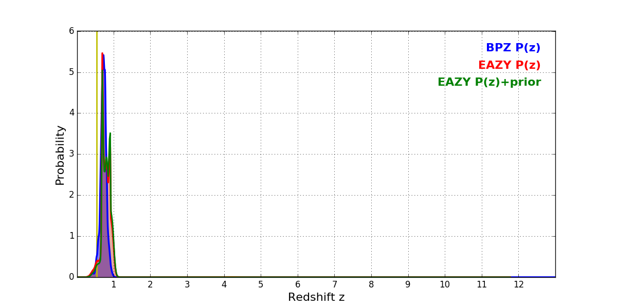 In P(z) plots: Yellow lines mark the cluster redshift z = 0.546,