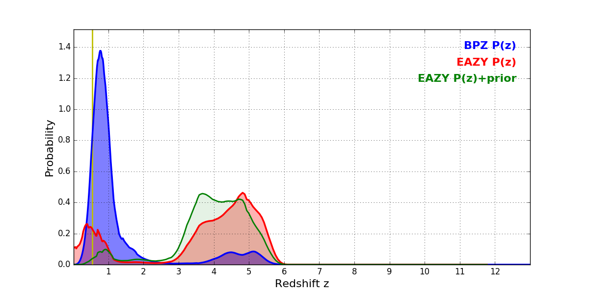 In P(z) plots: Yellow lines mark the cluster redshift z = 0.546,