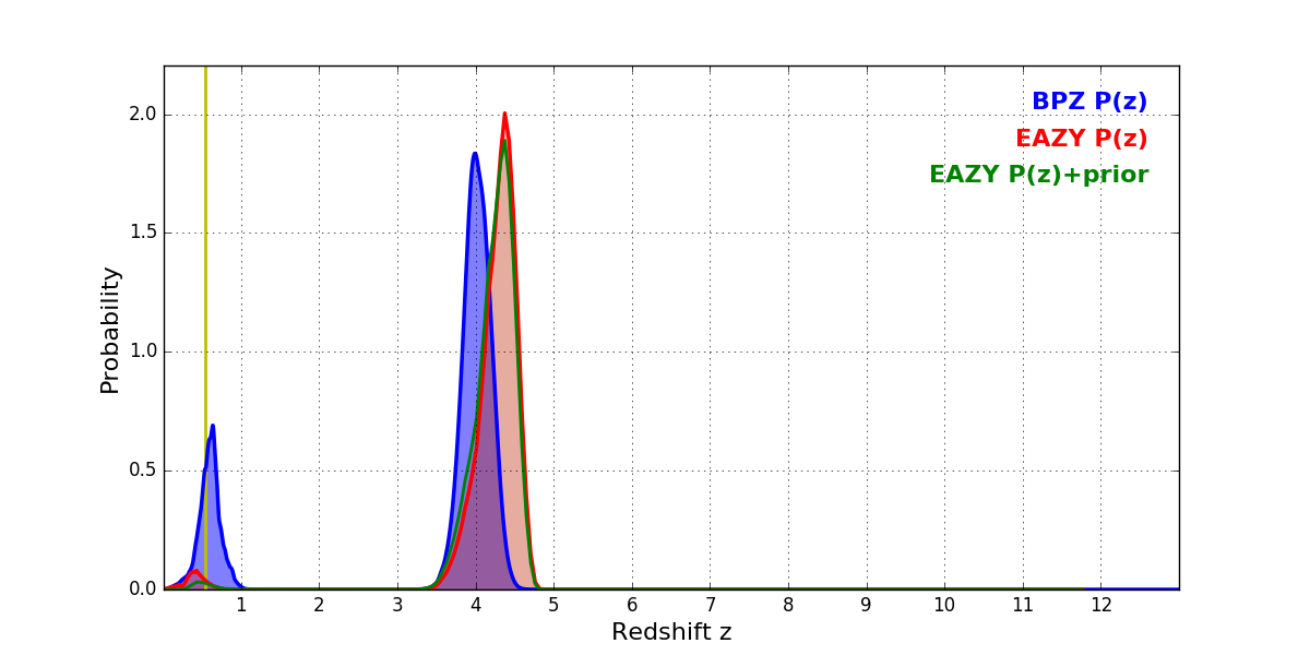 In P(z) plots: Yellow lines mark the cluster redshift z = 0.546,