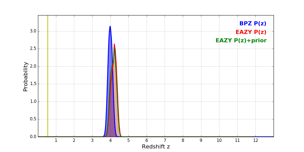 In P(z) plots: Yellow lines mark the cluster redshift z = 0.546,