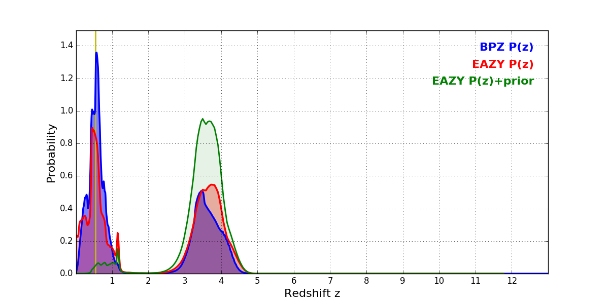 In P(z) plots: Yellow lines mark the cluster redshift z = 0.546,