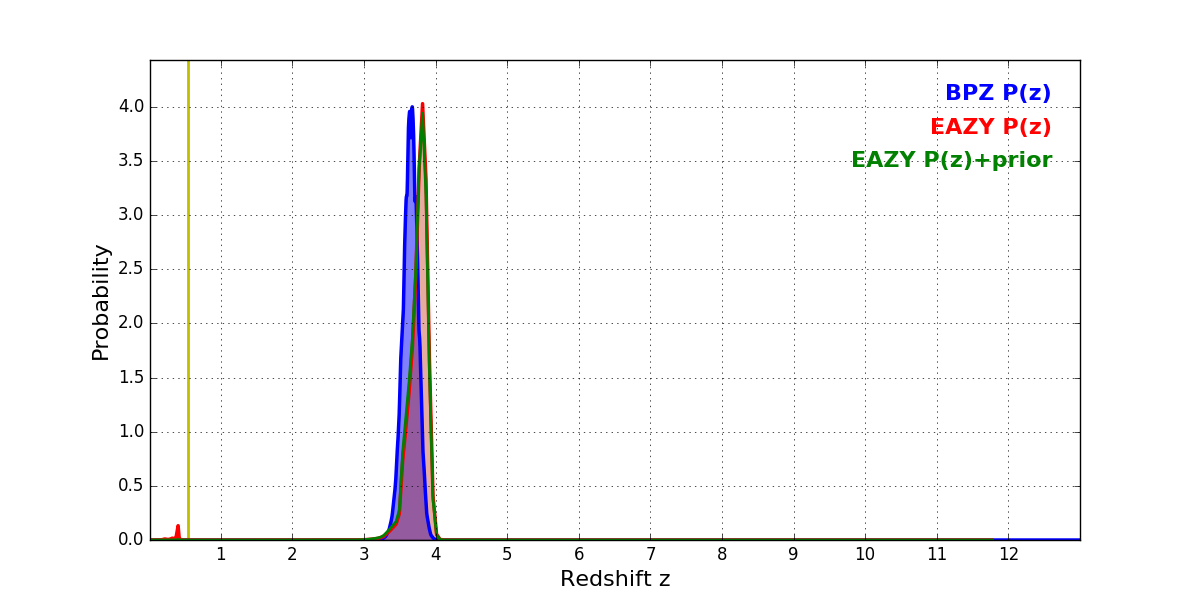 In P(z) plots: Yellow lines mark the cluster redshift z = 0.546,