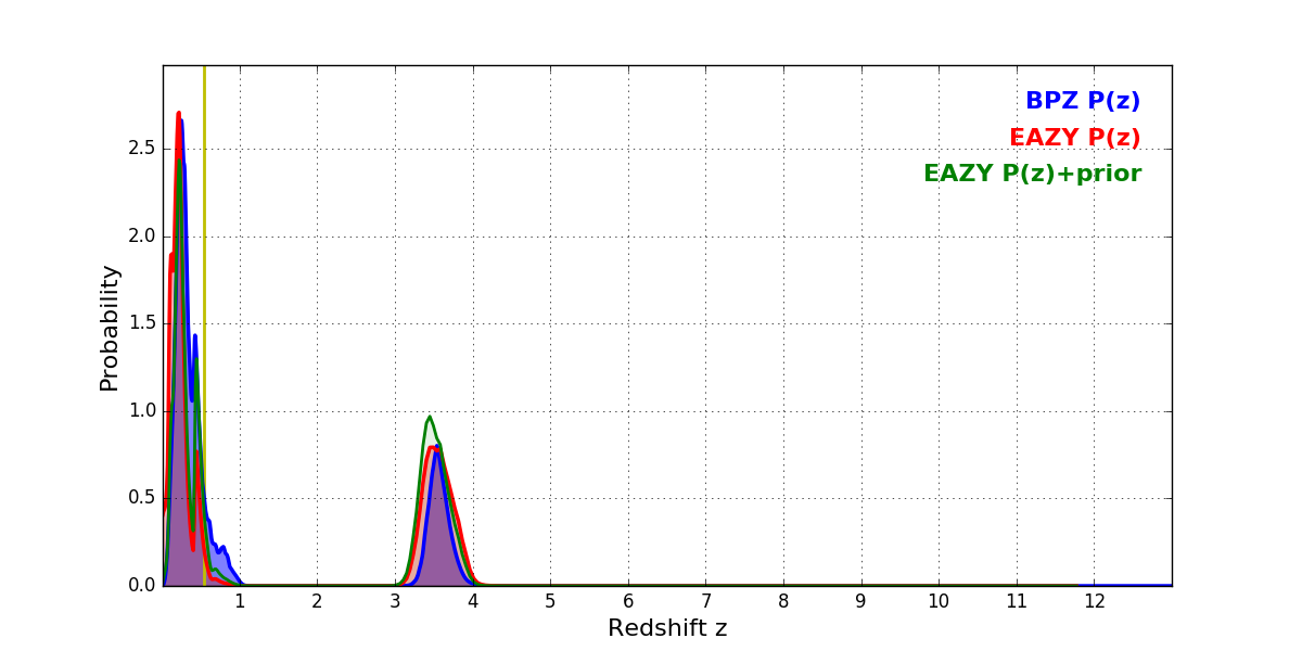 In P(z) plots: Yellow lines mark the cluster redshift z = 0.546,