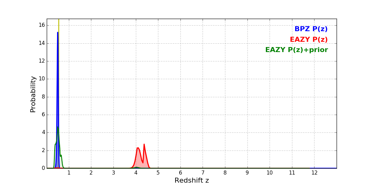 In P(z) plots: Yellow lines mark the cluster redshift z = 0.546,
