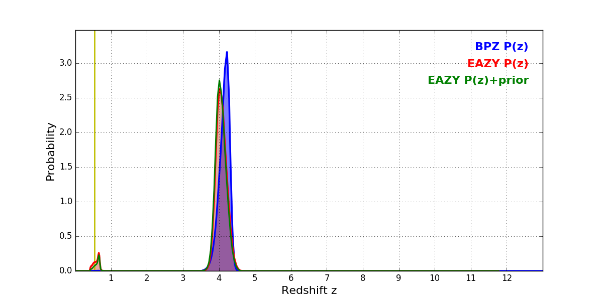 In P(z) plots: Yellow lines mark the cluster redshift z = 0.546,