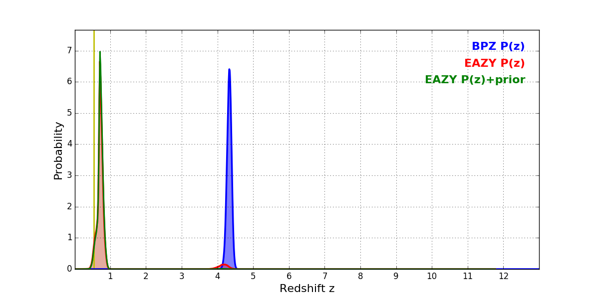 In P(z) plots: Yellow lines mark the cluster redshift z = 0.546,