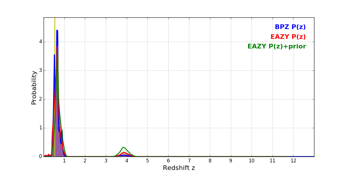 In P(z) plots: Yellow lines mark the cluster redshift z = 0.546,