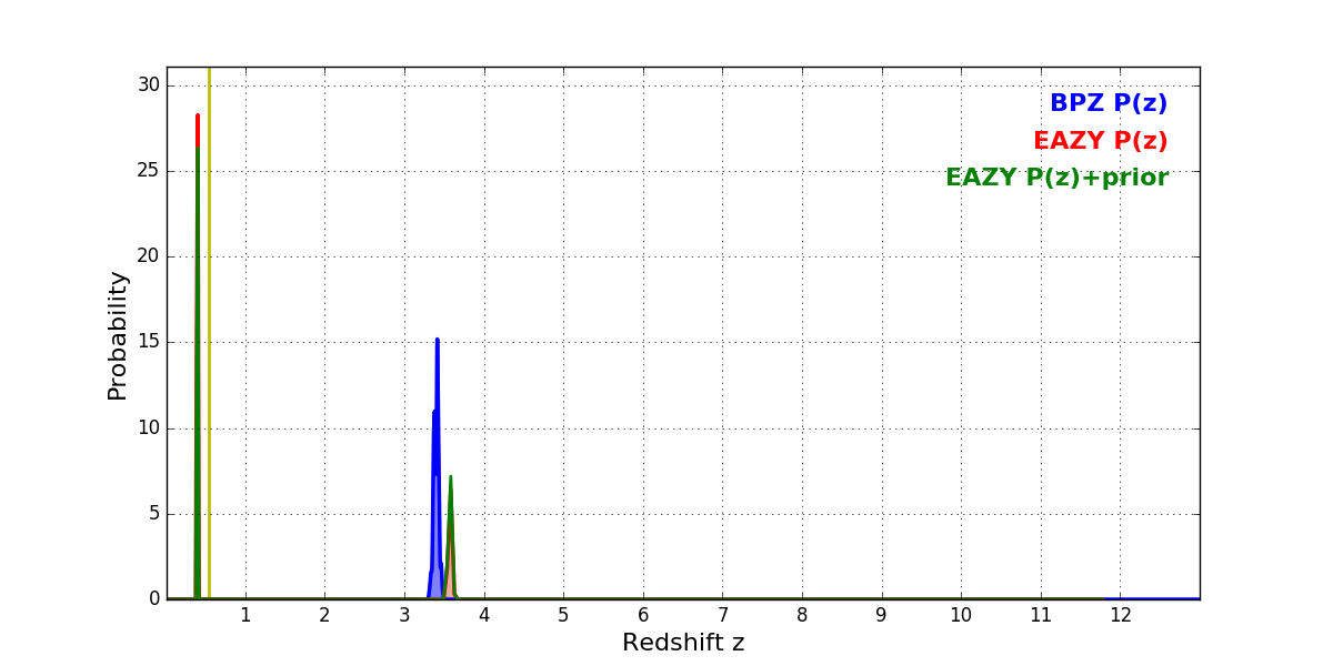 In P(z) plots: Yellow lines mark the cluster redshift z = 0.546,