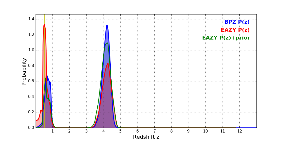 In P(z) plots: Yellow lines mark the cluster redshift z = 0.546,