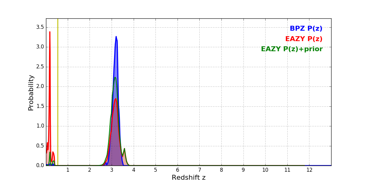 In P(z) plots: Yellow lines mark the cluster redshift z = 0.546,