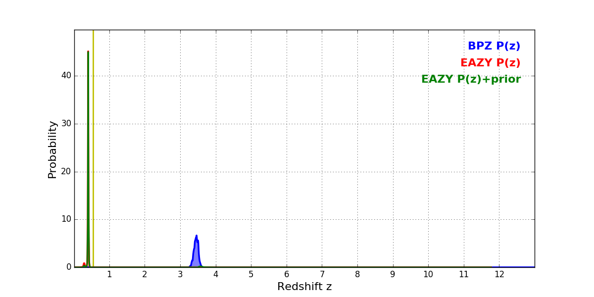 In P(z) plots: Yellow lines mark the cluster redshift z = 0.546,