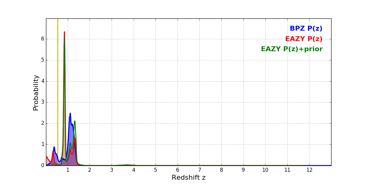 In P(z) plots: Yellow lines mark the cluster redshift z = 0.546,
