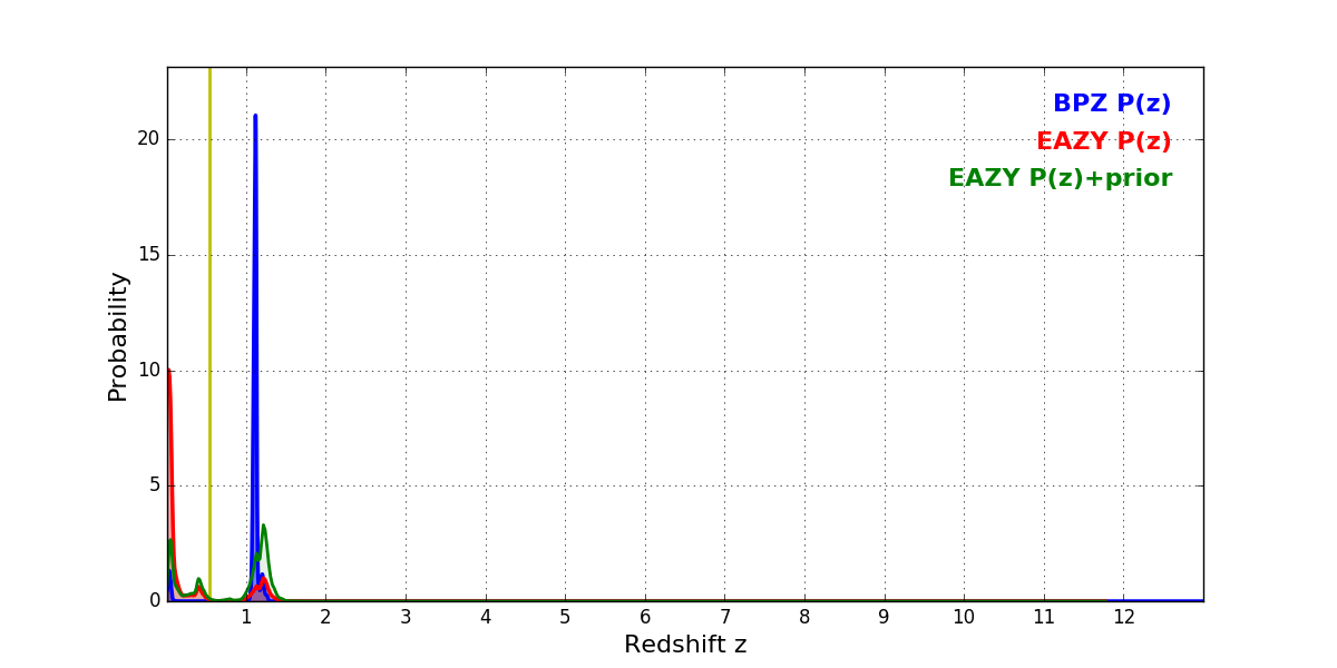 In P(z) plots: Yellow lines mark the cluster redshift z = 0.546,