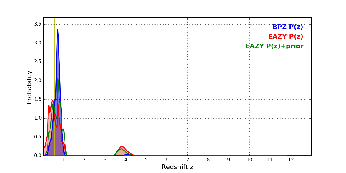 In P(z) plots: Yellow lines mark the cluster redshift z = 0.546,