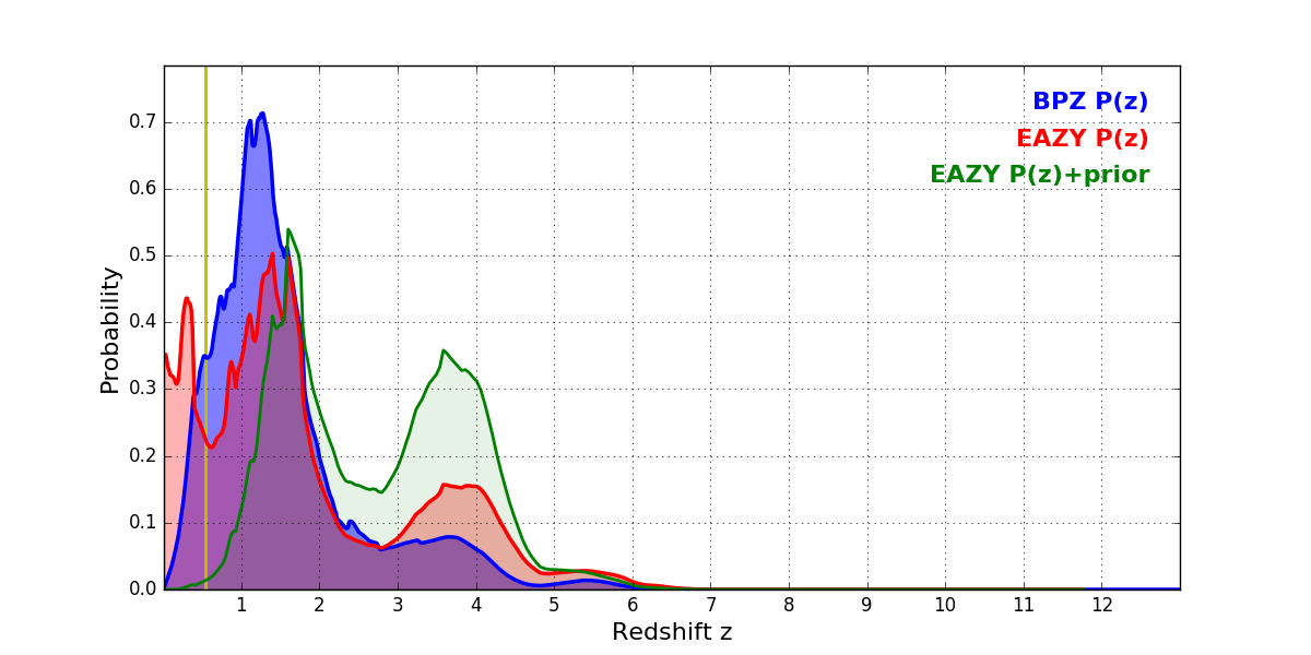 In P(z) plots: Yellow lines mark the cluster redshift z = 0.546,