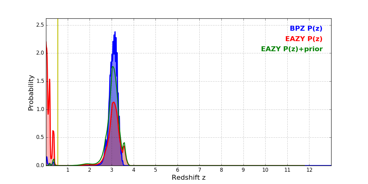 In P(z) plots: Yellow lines mark the cluster redshift z = 0.546,