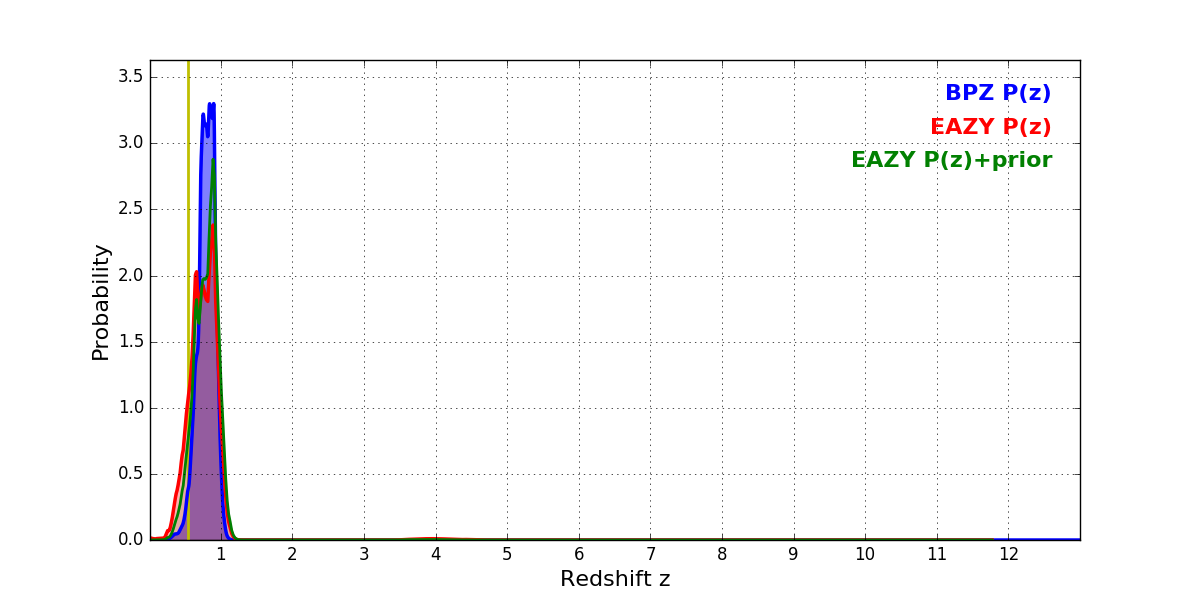 In P(z) plots: Yellow lines mark the cluster redshift z = 0.546,