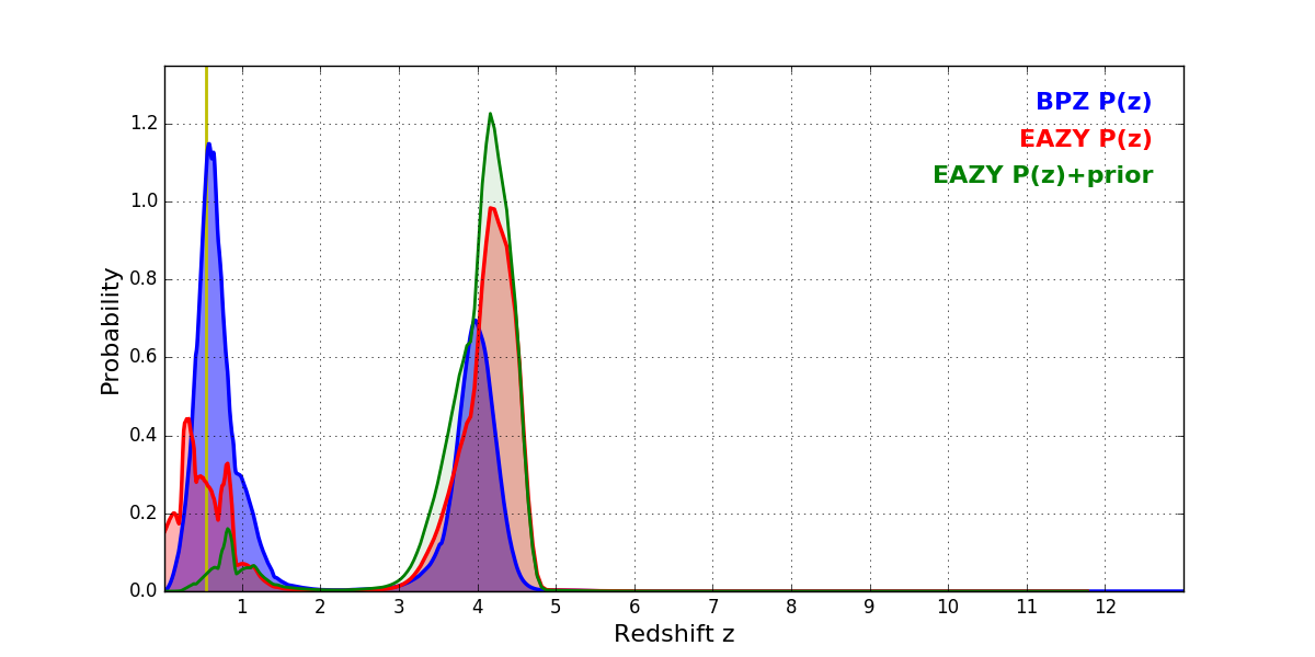 In P(z) plots: Yellow lines mark the cluster redshift z = 0.546,