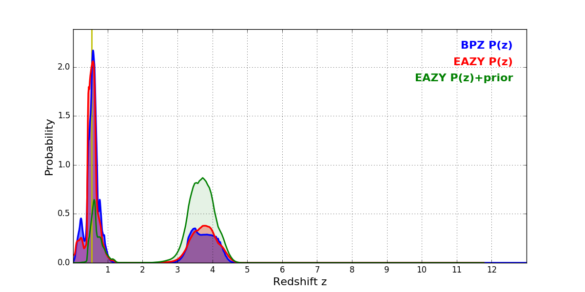 In P(z) plots: Yellow lines mark the cluster redshift z = 0.546,