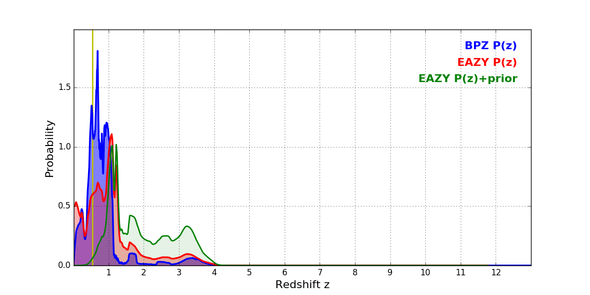 In P(z) plots: Yellow lines mark the cluster redshift z = 0.546,