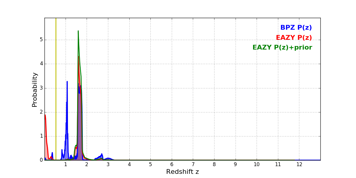 In P(z) plots: Yellow lines mark the cluster redshift z = 0.546,