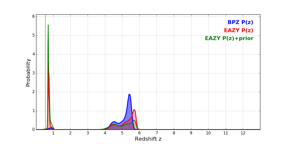 In P(z) plots: Yellow lines mark the cluster redshift z = 0.546,