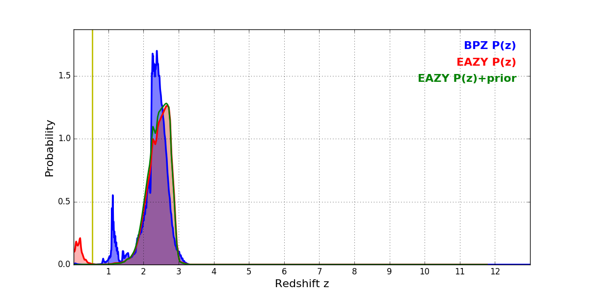 In P(z) plots: Yellow lines mark the cluster redshift z = 0.546,