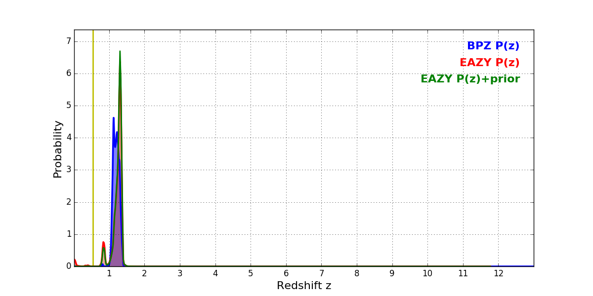 In P(z) plots: Yellow lines mark the cluster redshift z = 0.546,