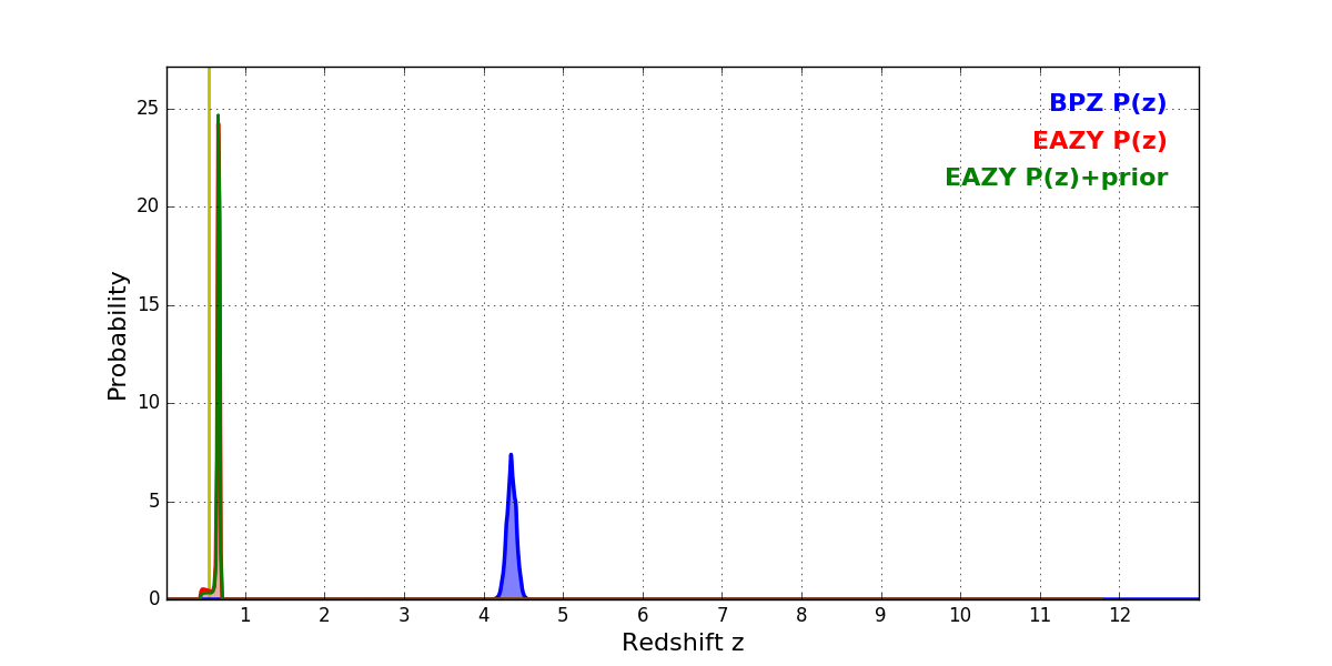 In P(z) plots: Yellow lines mark the cluster redshift z = 0.546,