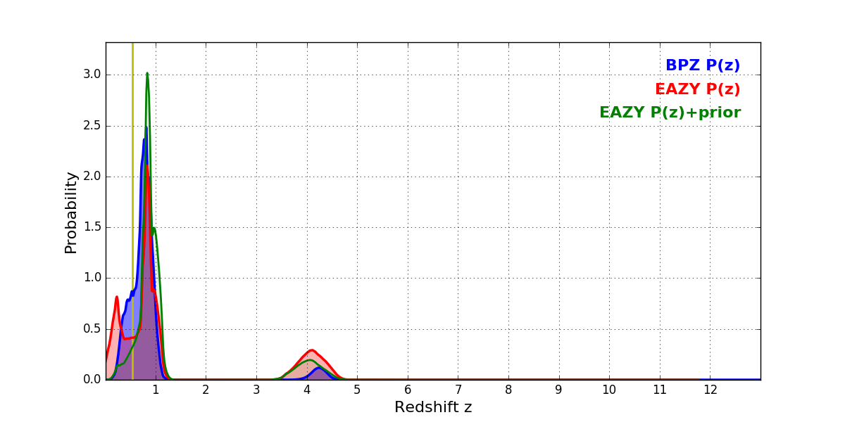 In P(z) plots: Yellow lines mark the cluster redshift z = 0.546,