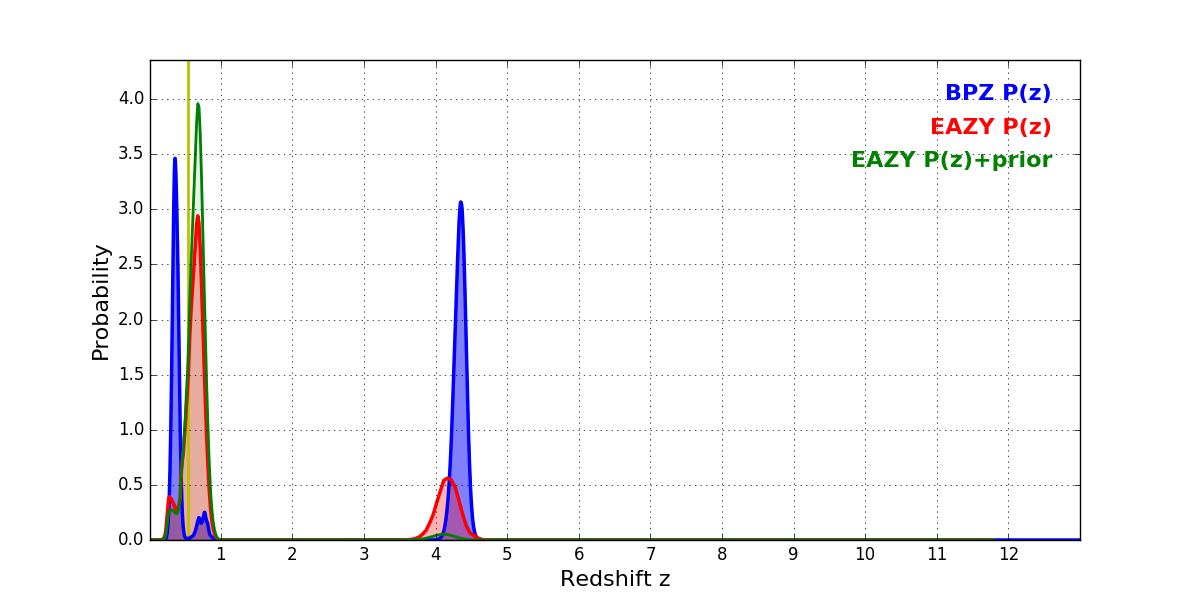 In P(z) plots: Yellow lines mark the cluster redshift z = 0.546,