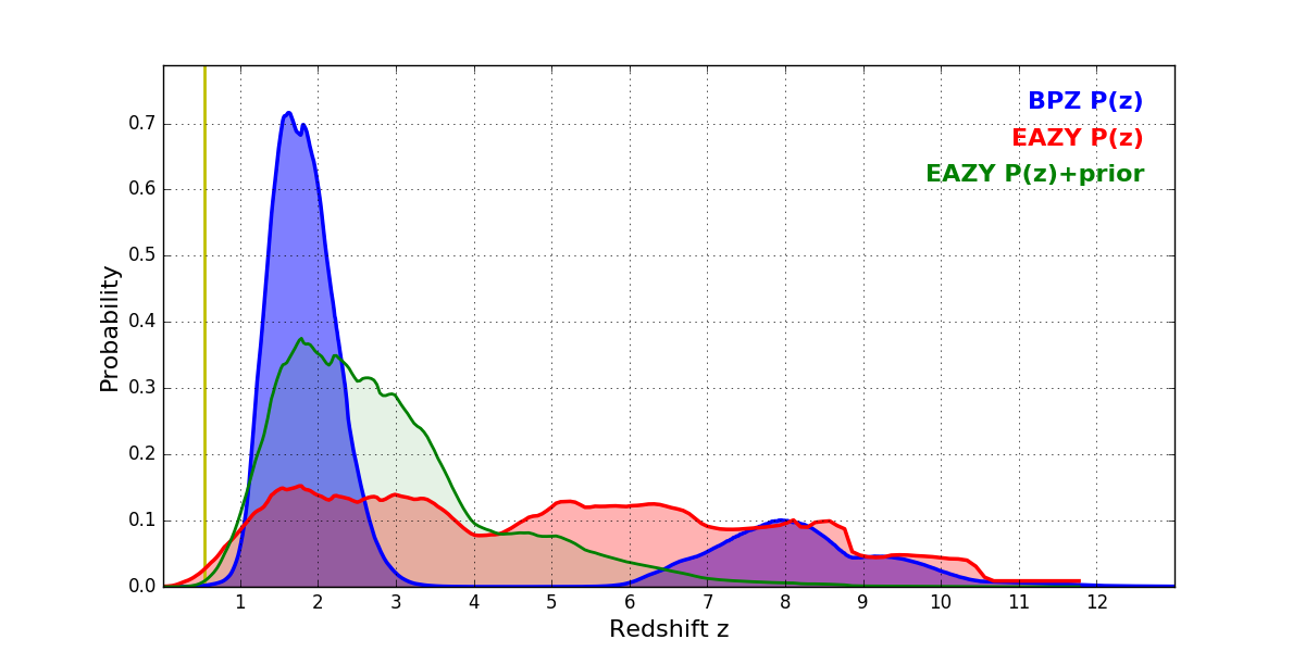 In P(z) plots: Yellow lines mark the cluster redshift z = 0.546,