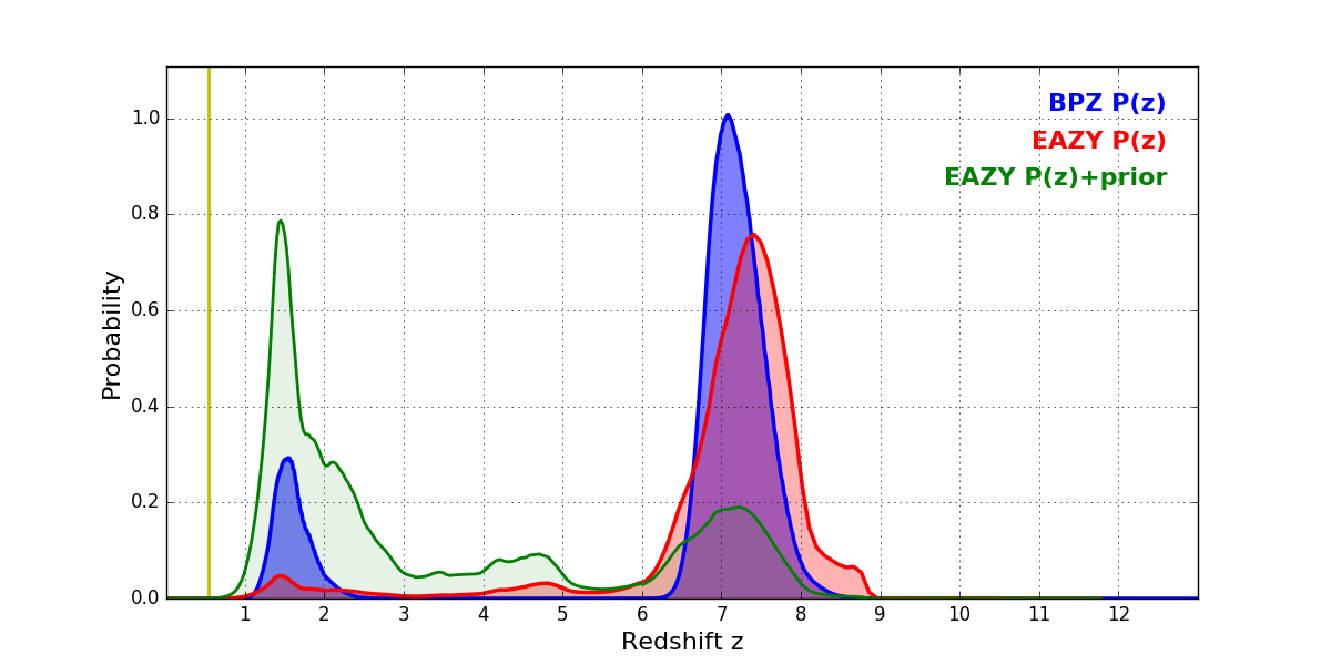 In P(z) plots: Yellow lines mark the cluster redshift z = 0.546,