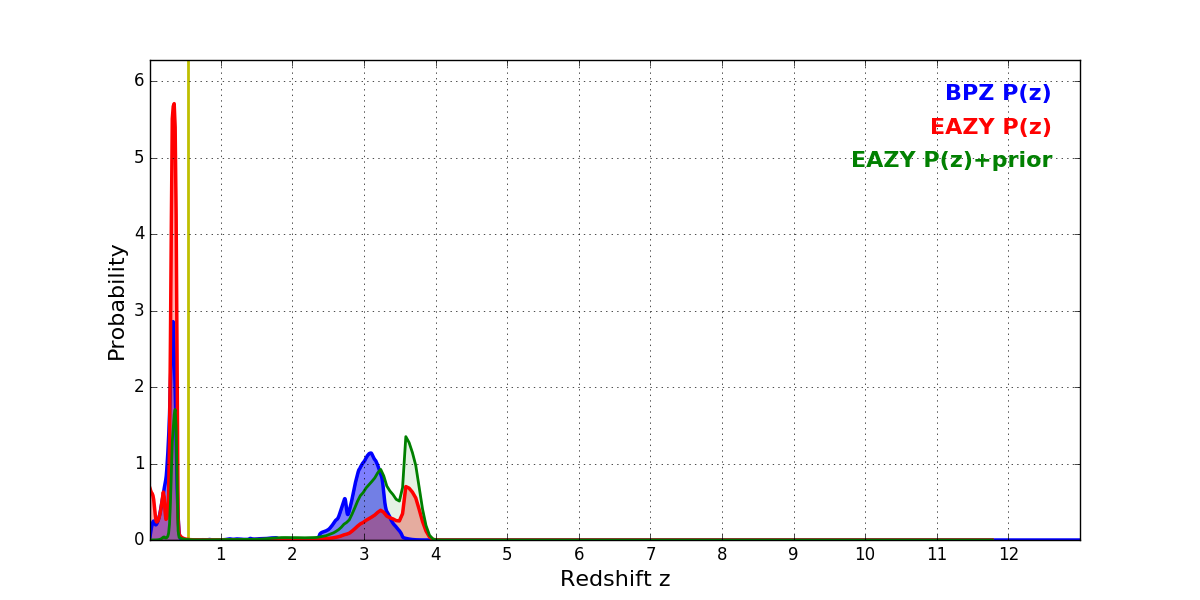 In P(z) plots: Yellow lines mark the cluster redshift z = 0.546,