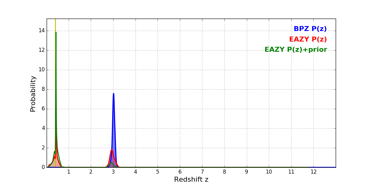 In P(z) plots: Yellow lines mark the cluster redshift z = 0.396,