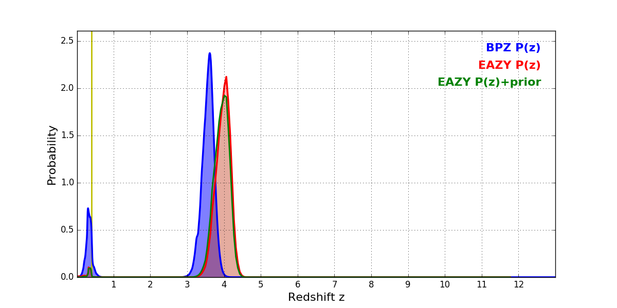 In P(z) plots: Yellow lines mark the cluster redshift z = 0.396,