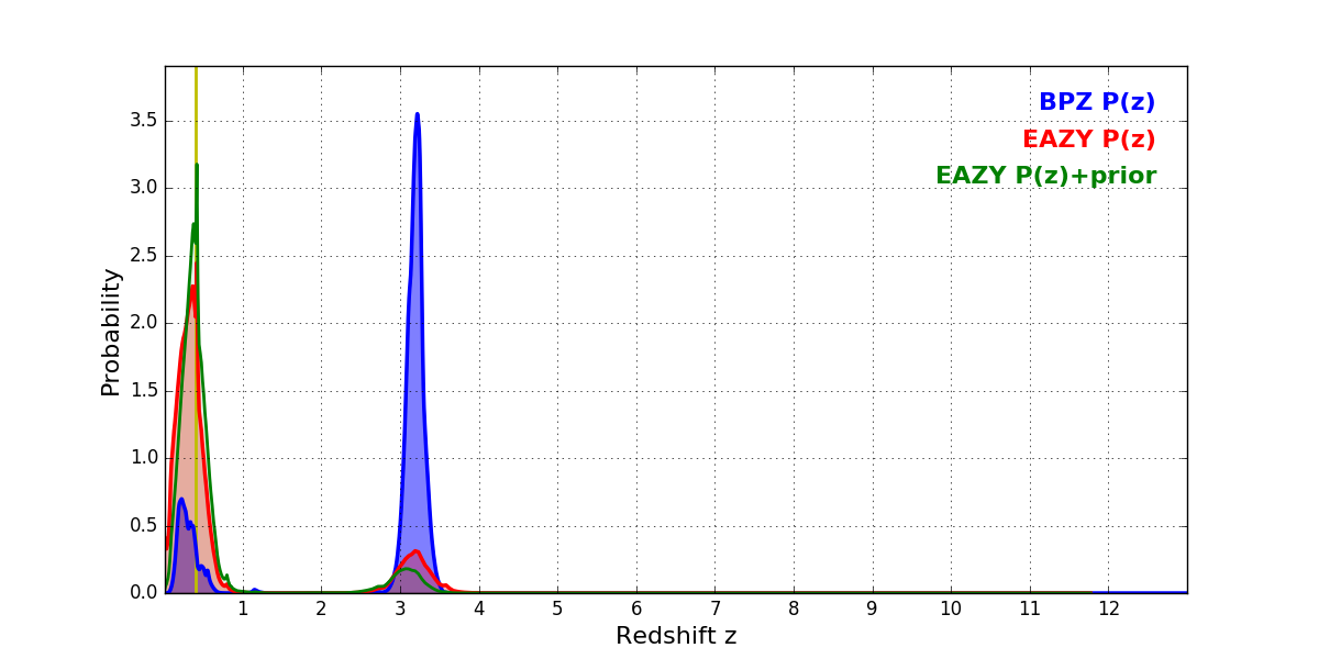 In P(z) plots: Yellow lines mark the cluster redshift z = 0.396,