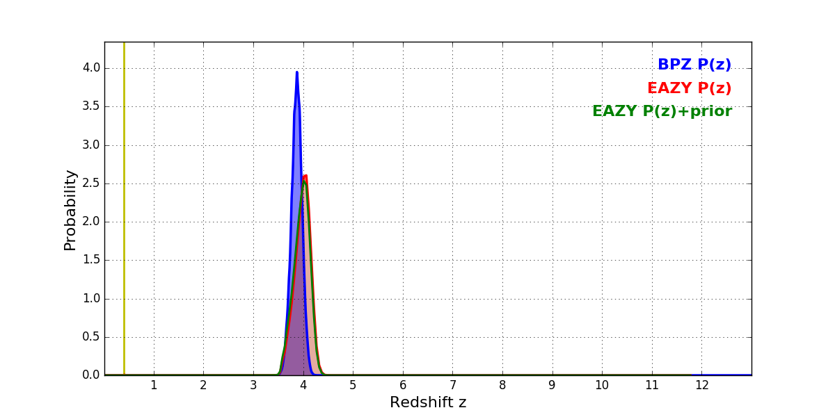 In P(z) plots: Yellow lines mark the cluster redshift z = 0.396,