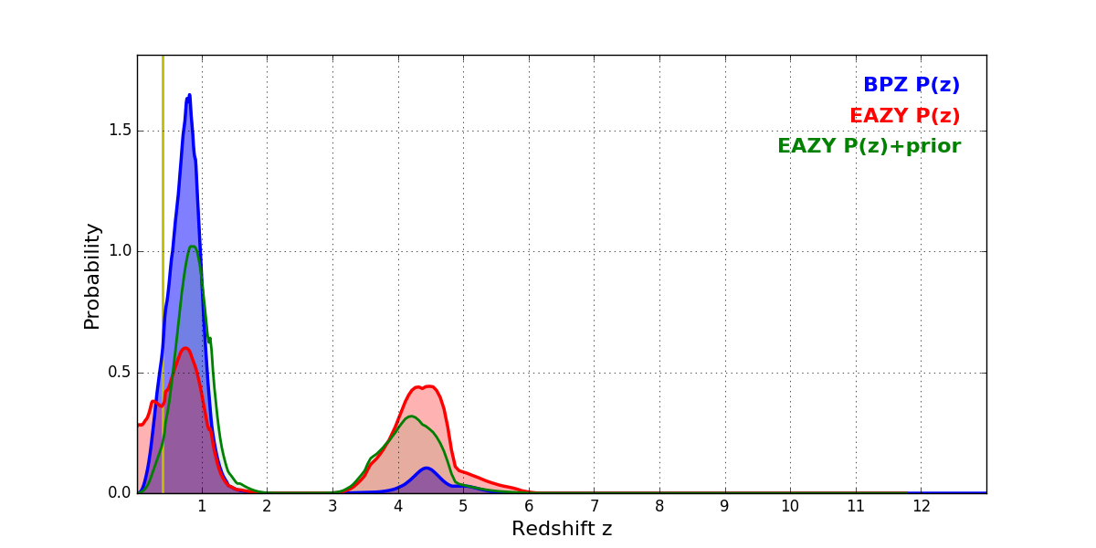In P(z) plots: Yellow lines mark the cluster redshift z = 0.396,