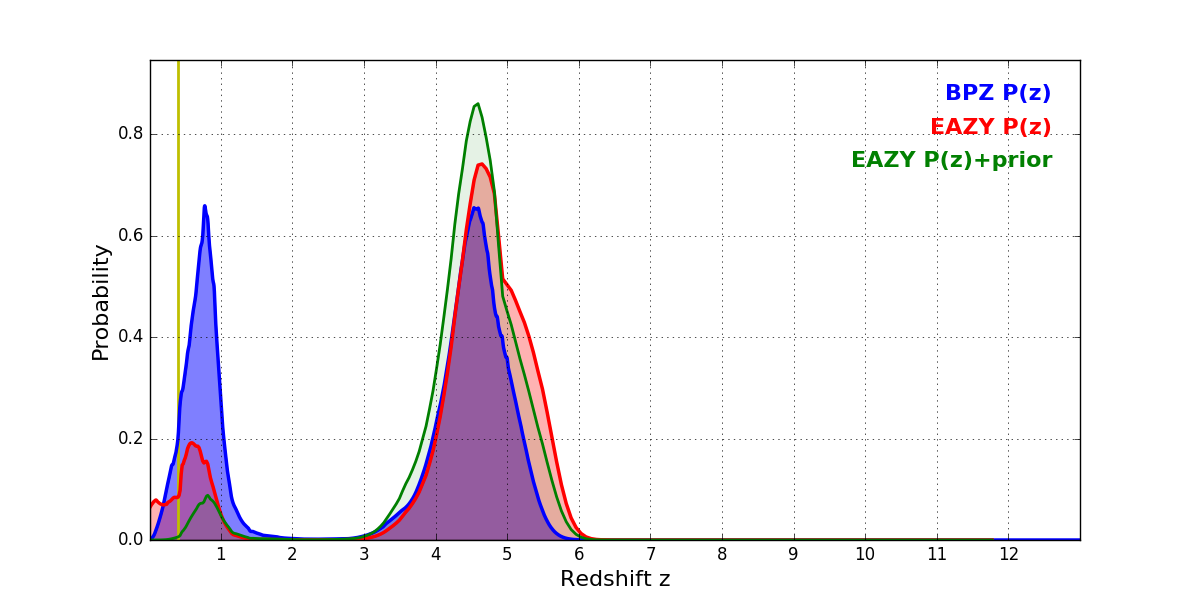 In P(z) plots: Yellow lines mark the cluster redshift z = 0.396,