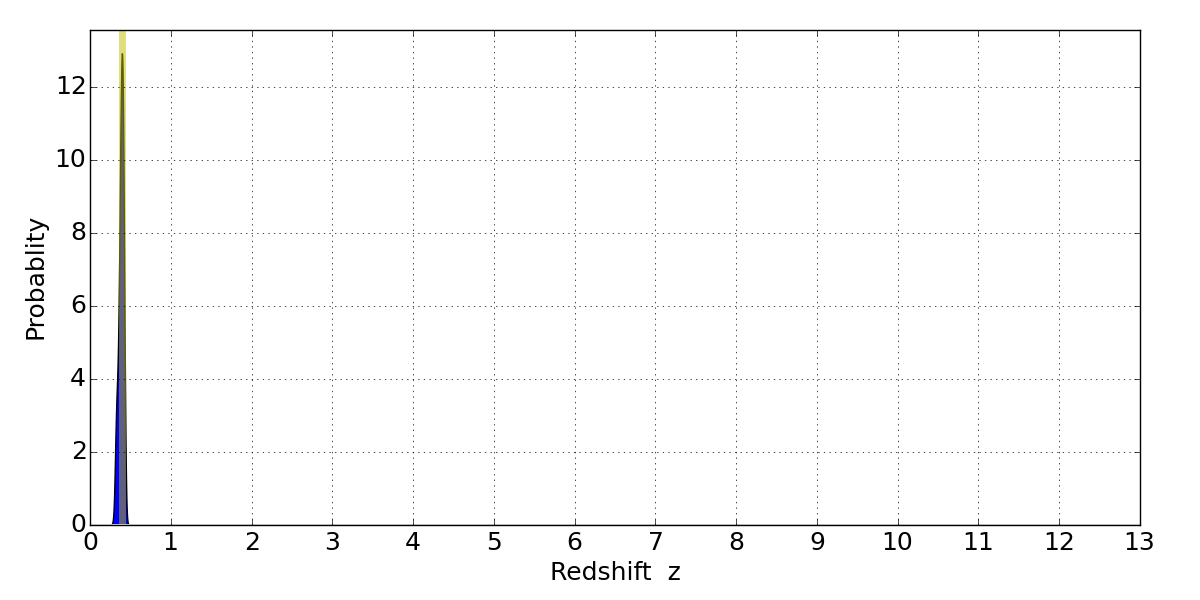 In P(z) plots: Yellow lines mark the cluster redshift z = 0.396,