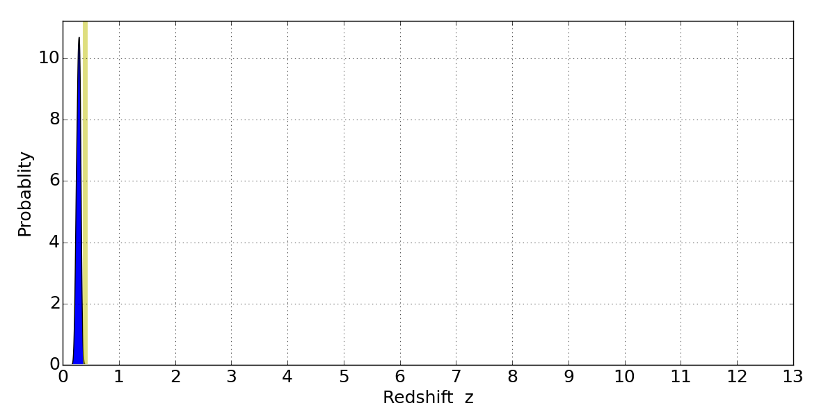 In P(z) plots: Yellow lines mark the cluster redshift z = 0.396,