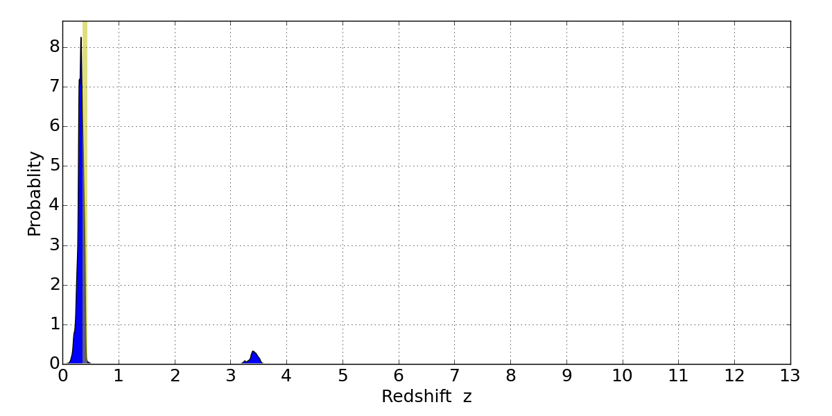 In P(z) plots: Yellow lines mark the cluster redshift z = 0.396,