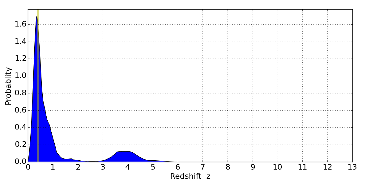 In P(z) plots: Yellow lines mark the cluster redshift z = 0.396,