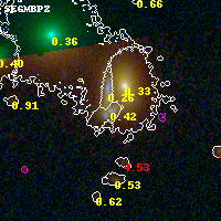 Object #1184 x,y = (2004, 3458) RA, Dec = (00:32:13.344, 18:08:50.28) = (8.05560, 18.14730) BPZ = 0.416 [0.227--0.468] type = 7.50 (SB1_B10 - Scd_B10) chisq2 = 0.10 ODDS = 0.48 z_cluster = 0.396
