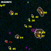 Object #1284 x,y = (2900, 3419) RA, Dec = (00:32:09.576, 18:08:48.12) = (8.03990, 18.14670) BPZ = 4.794 [4.571--5.138] type = 10.10 (SB3_B10 - SB11_A_0_l) chisq2 = 0.31 ODDS = 0.86 z_cluster = 0.396