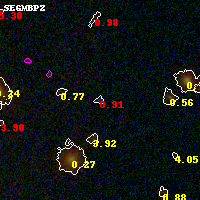 Object #1319 x,y = (2611, 3394) RA, Dec = (00:32:10.800, 18:08:46.32) = (8.04500, 18.14620) BPZ = 0.908 [0.180--1.067] type = 10.40 (SB3_B10 - SB11_A_0_l) chisq2 = 1.76 ODDS = 0.49 z_cluster = 0.396
