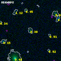 Object #1412 x,y = (1155, 3283) RA, Dec = (00:32:16.920, 18:08:39.84) = (8.07050, 18.14440) BPZ = 0.301 [0.253--3.492] type = 8.60 (SB2_B10 - SB1_B10) chisq2 = 0.50 ODDS = 0.19 z_cluster = 0.396