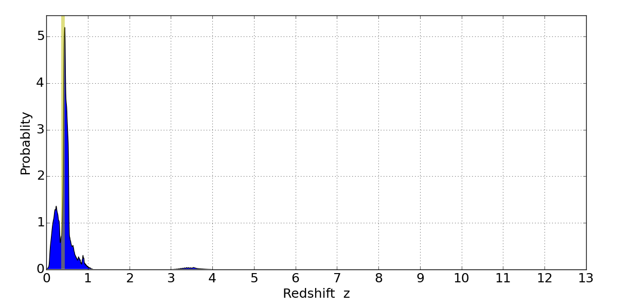 In P(z) plots: Yellow lines mark the cluster redshift z = 0.396,